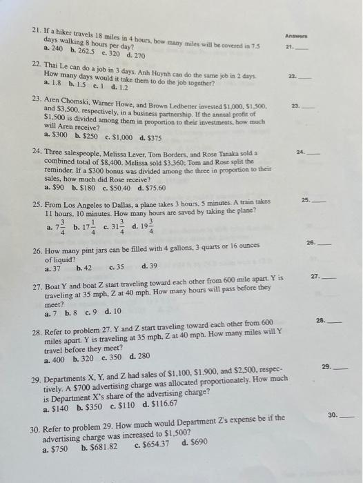 Solved Answers 21 21 If A Hiker Travels 18 Miles In 4 Chegg Com